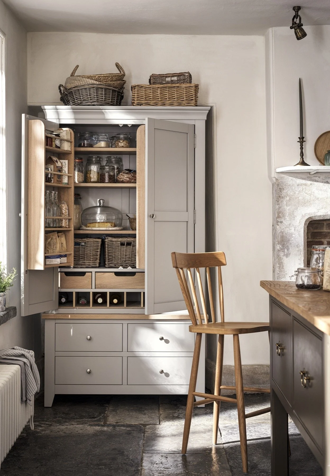 This summer’s colour palette draws inspiration from the natural world, with soft whites, gentle sage greens and warm oak tones taking centre stage. The much-loved Chester collections strike a perfect balance between rustic charm and modern design. Standout pieces such as the generously sized double larder and practical butcher’s block are not only beautiful but built to last - thanks to traditional joinery techniques like mortise and tenon frames and dovetailed drawers. Complementing these hero pieces are hand-finished ceramics, rattan accessories and woven storage baskets, adding tactile interest and timeless character to your kitchen.