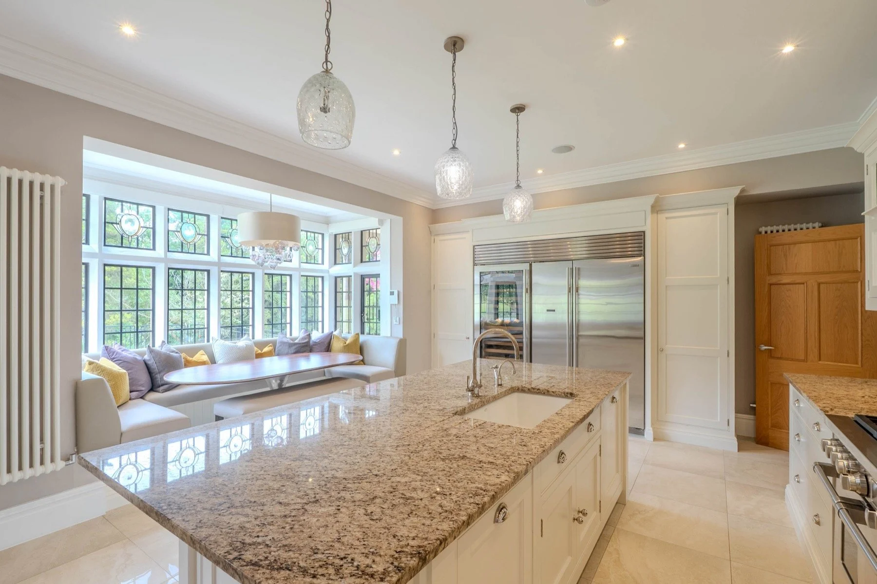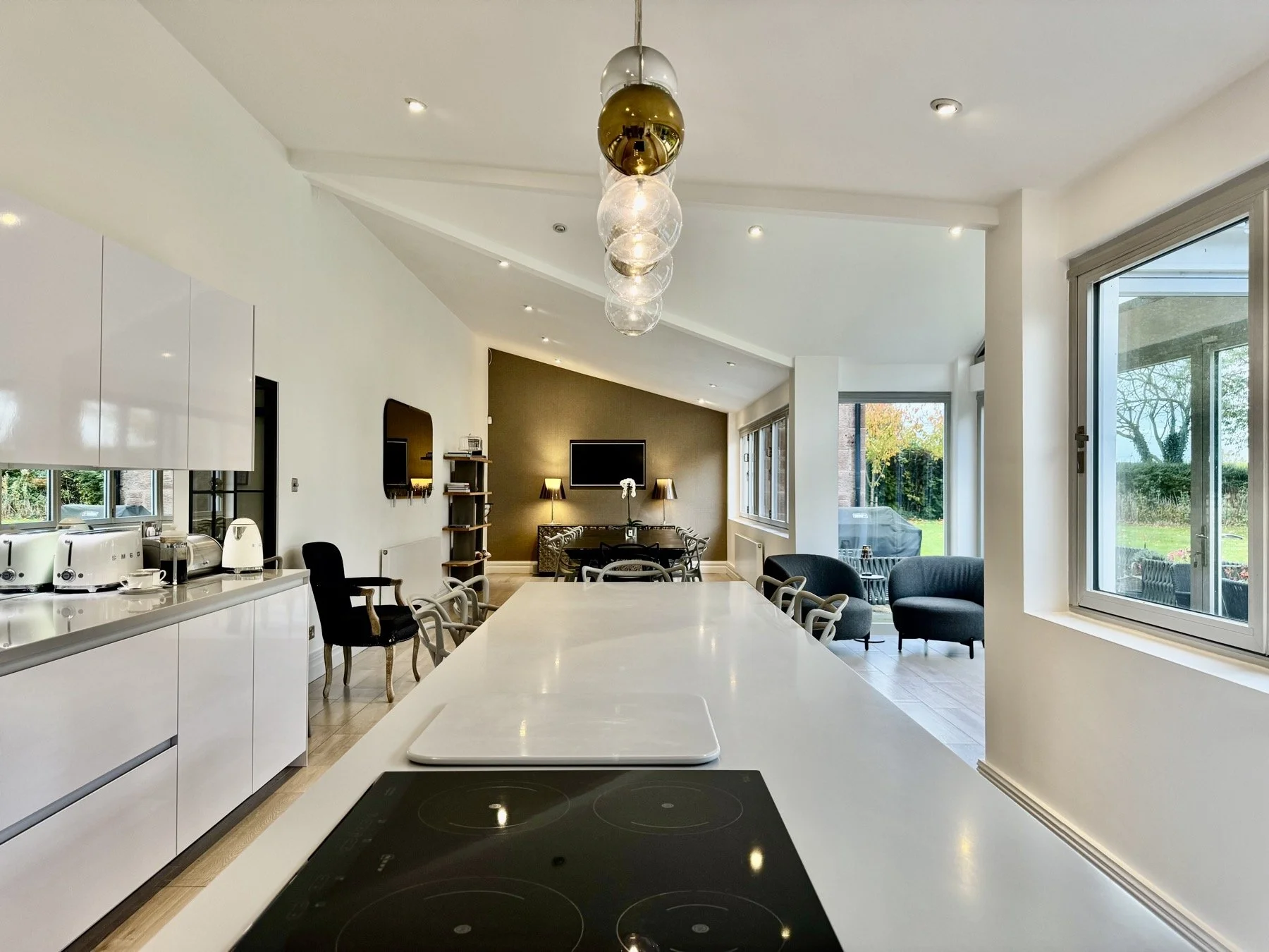 Inside, Hall Cottage has been restored and thoughtfully modernised with design flair, retaining its character features while offering all the comforts of modern living. At the heart of the home is a spectacular open-plan kitchen. A light-filled, versatile space perfect for both relaxed family life and entertaining. Wall-to-wall glass doors and windows frame stunning views of the gardens and surrounding greenbelt land. A generous dining and sitting area, together with a central island, make this a superb space for informal gatherings.