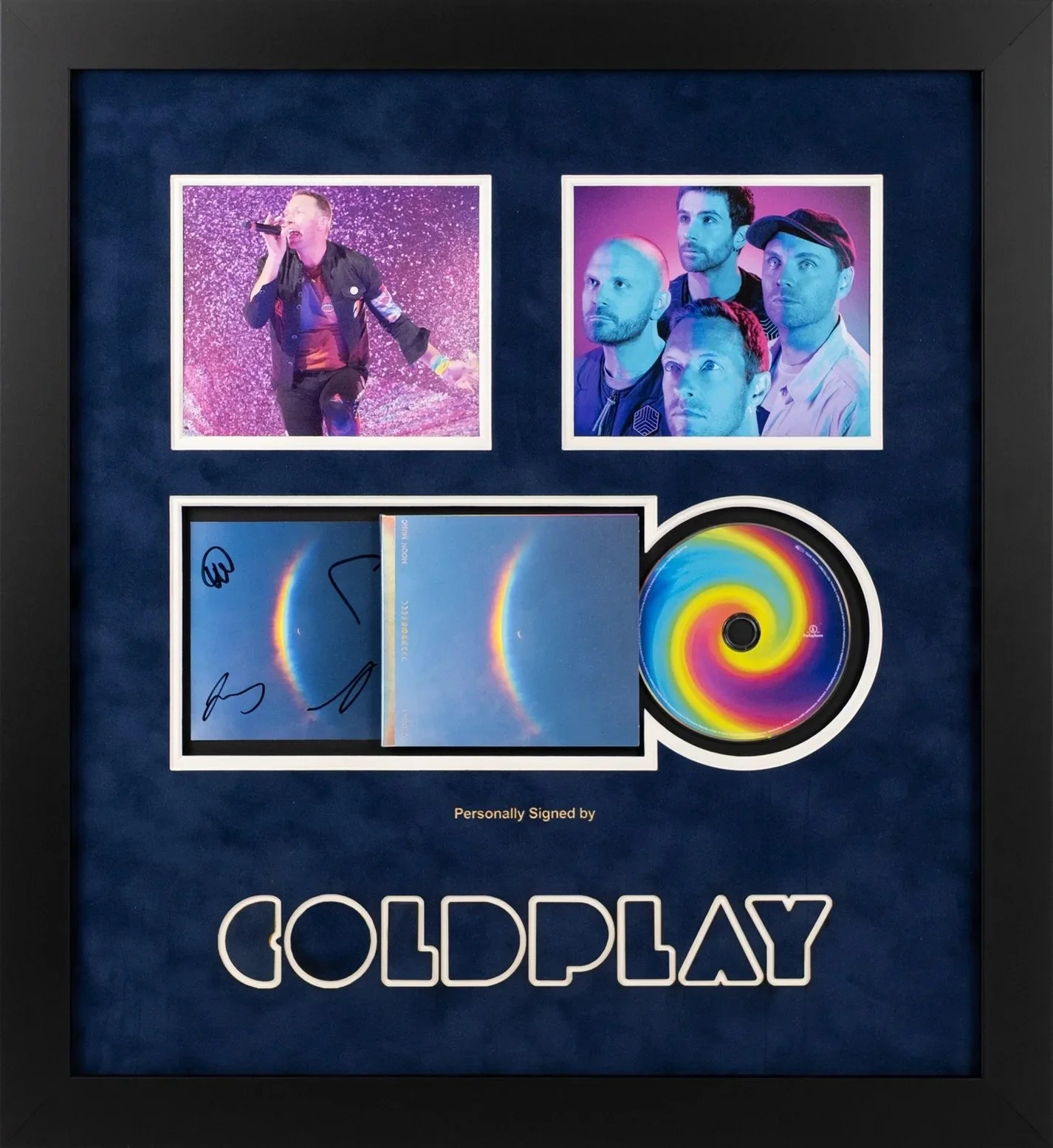 This elegant display features a personally signed CD from global superstars Coldplay, celebrating their highly anticipated tenth studio album, Moon Music. Beautifully presented in a sleek black wooden frame, with double suede mount boards in rich blue tones that reflect the celestial theme of Moon Music. Two carefully selected photographs capture the band’s iconic stage presence. Below, clean laser-cut lettering completes the display with a polished, contemporary edge.
