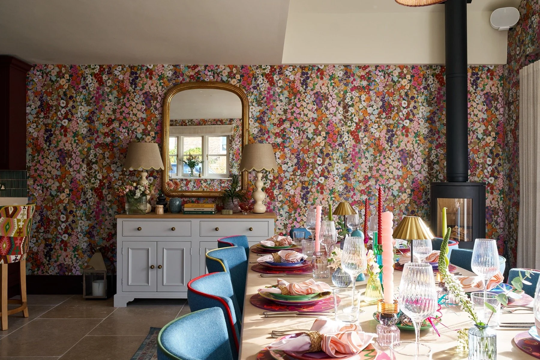 One of my favourite projects is Pickmere Party Barn, where we used House of Hackney’s Hollyhocks wallpaper in the dining area. The bold floral design immediately set the tone for the space, giving it a vibrant, playful energy. In the open-plan layout, the wallpaper anchored the dining zone and gave it a clear identity, while still allowing the rest of the room to feel cohesive. Paired with deep aubergine walls and statement lighting, the result feels luxurious, joyful and intentionally designed.