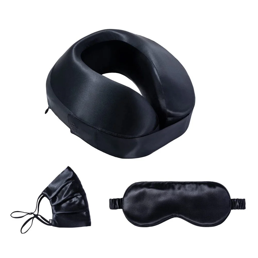 This silk set includes a travel pillow and eye mask to ensure comfort during travel allowing me to arrive at my destination feeling refreshed.